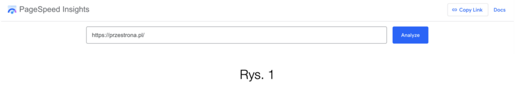 Świetnym i prostym w obsłudze narzędziem do sprawdzenia prędkości swojej strony jest PageSpeed Insight od Google. Wystarczy wejść na pagespeed.web.dev (Rys. 1) i w polu tekstowym wpisać adres strony i kliknąć “Analyze”.